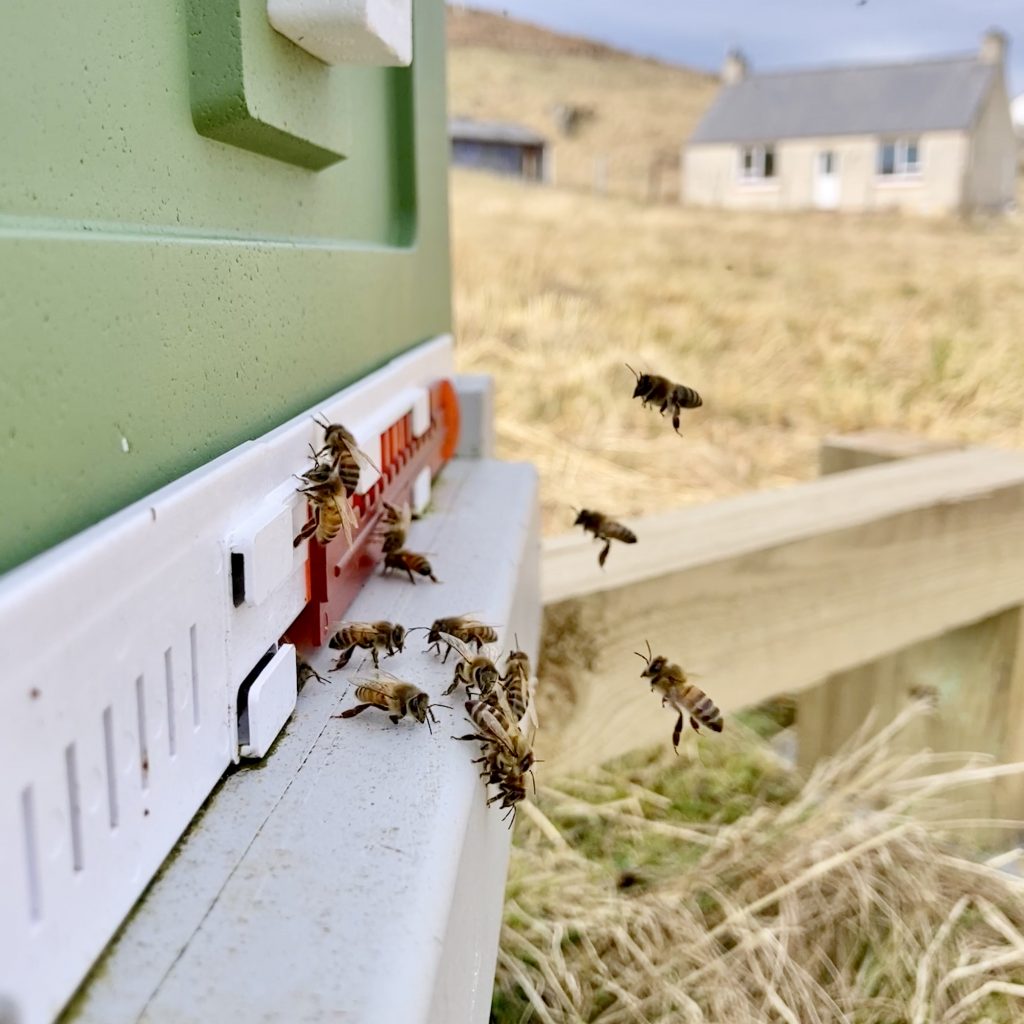 So here in Lewis, and much of the North and West of Scotland, first inspections are on hold as the temperature never quite seems to hit double figures. I can see fresh snow on An Cliseam (the islands highest point at 799m) and at 6am it might be 1°C one day or 8°C the next. I’m sure the bees are itching to spread their wings and make a start on the season because whenever the temperature does hit 10°C or the sun comes out and the wind drops giving a warm feeling there is a flurry of activity.